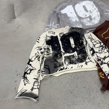 เสื้อยืดแขนยาวเทอร์รี่บ็อกซี่พิมพ์ลายกราฟฟิกวินเทจออกแบบได้ตามต้องการ